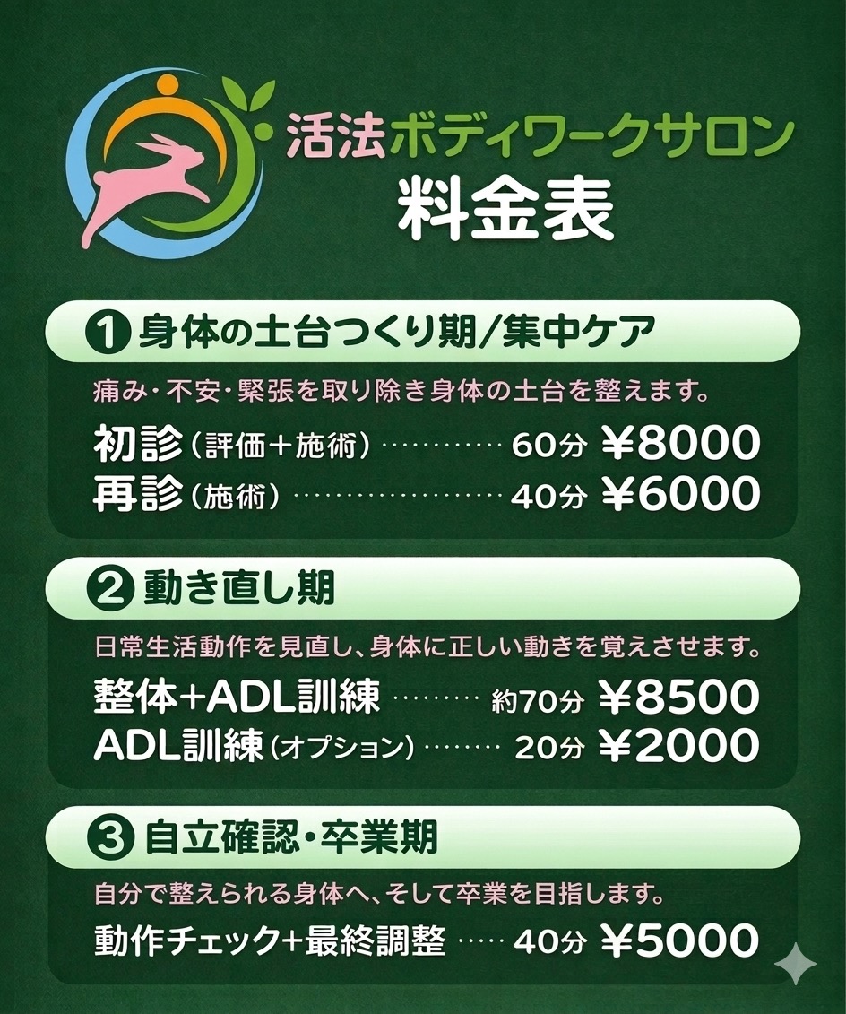 〜活法ボディワークサロンの考え方〜 整体や治療院に通うとき、 「いつまで通えばいいんだろう…」 「良 […] -