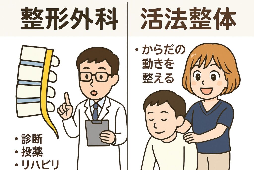一方で、整体(特に活法整体)では体の使い方筋肉・関節の動きを整え、日常生活での回復を後押しするケアが可能です。