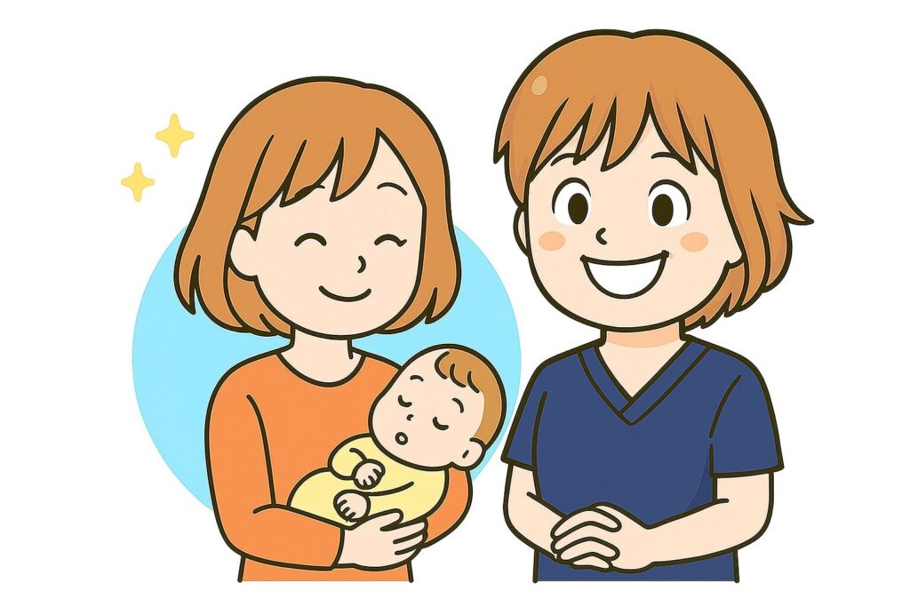 👉 赤ちゃんを抱っこして微笑むお母さんと、そのそばで安心して見守る整体師のイラスト